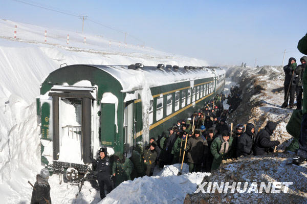 車體一點(diǎn)點(diǎn)地被積雪吞噬,搶險(xiǎn)隊(duì)員們剛剛搶通的線路眨眼間又被暴風(fēng)雪掩埋。列車受困的位置恰好處在一個(gè)洼地處,暴風(fēng)雪壘起的雪墻與車身之間只剩下了一條只能容下一人行走的小窄縫,寬度不斷地在縮小。搶險(xiǎn)隊(duì)員只有采取單邊接力,兩頭推進(jìn)的方式,一點(diǎn)點(diǎn)擴(kuò)大雪墻與車廂內(nèi)旅客的距離。列車上的燃料逐步減少,隨時(shí)面臨停水、停電、停暖,1400余名旅客的生命安全受到了嚴(yán)重威脅。