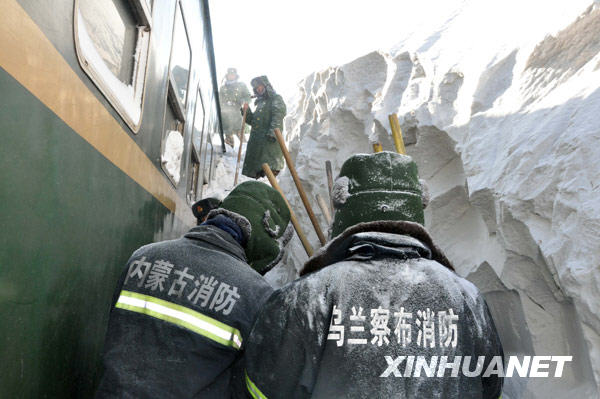 1月4日,消防戰(zhàn)士在內(nèi)蒙古商都受暴雪圍困的旅客列車邊除雪搶險(xiǎn)。新華社發(fā)(田瑜 攝)