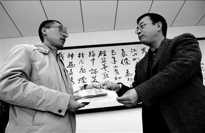 小張(左)從全國(guó)“掃黃打非”辦公室負(fù)責(zé)人黃曉新手中接過(guò)獎(jiǎng)金。記者蒲東峰攝