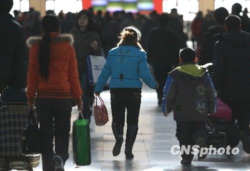 1月21日,一對母子在北京站準備上車。北京鐵路局根據北京地區客流特點宣布,從1月20日起北京鐵路運輸部門進入春運狀態,這比全國春運提前了10天,春運將一直持續到3月10日。 中新社發 蘇丹 攝