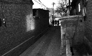 昨晚,3名警察從案發(fā)院子走出。 記者 秦斌 攝