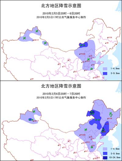 2010年2月5日20時-7日20時北方地區降雪示意圖