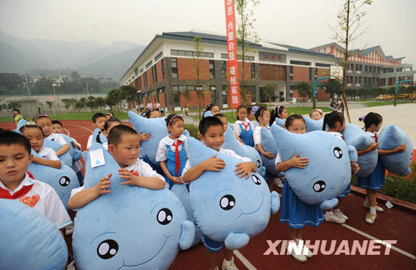 2009年9月1日,在都江堰市北街小學新校區(qū),師生們舉行了開學典禮。當日,都江堰市災后重建竣工投入使用的48所中小學校交接儀式暨2009年秋季開學典禮在都江堰市北街小學新校區(qū)舉行。全市7萬余名中小學生全部告別了板房學校,搬進了災后重建的永久性校園學習。 新華社記者 江宏景 攝
