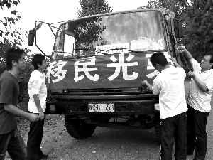 均縣鎮政府工作人員為搬家卡車掛上標語。