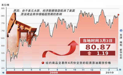 3月4日,受到歐元兌美元走高的影響,紐約原油日略有下跌,不過,依然徘徊在80美/桶元上下。前一日,國際油價沖高至每桶80.87美元。