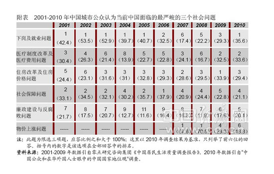 調(diào)查顯示,公眾認為當(dāng)前中國面臨的最嚴峻的三個社會問題中,下崗就業(yè)、醫(yī)療改革和住房改革排在前三位,占比分別為35.6%、33.6%和29.4%。