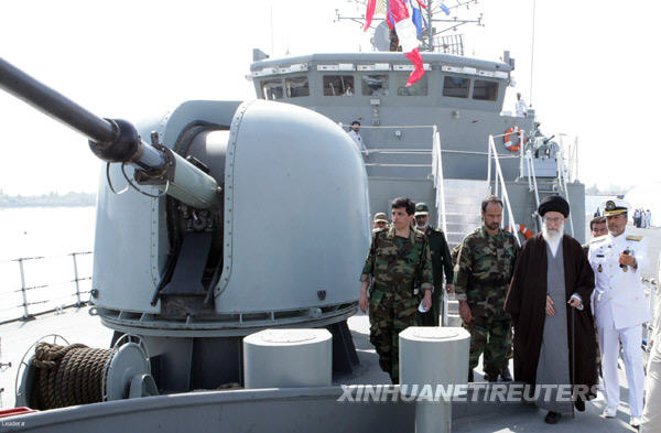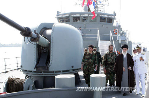 資料圖片:2月19日,在伊朗南部城市阿巴斯港,伊朗最高領袖哈梅內伊(前右二)參加“賈馬蘭”號驅逐艦的下水儀式。新華社/路透