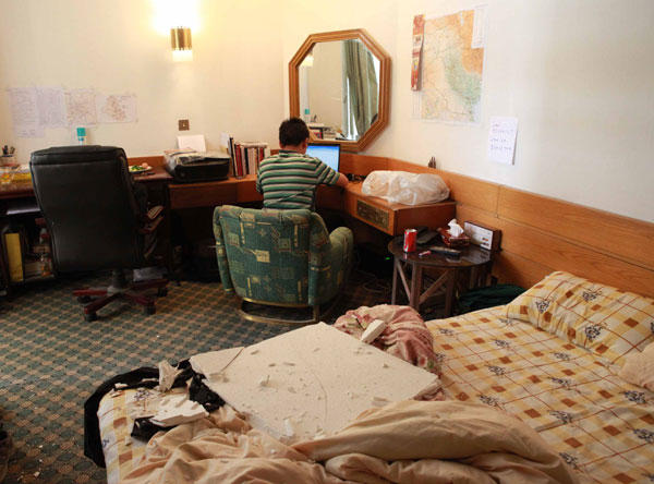 4月4日,在伊拉克首都巴格達,新華社駐巴格達分社記者在爆炸受損的房間中搶發稿件。 新華社記者宋聃攝