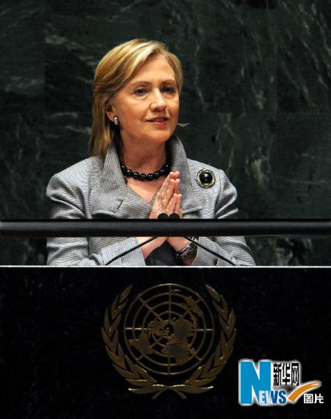 5月3日,在美國紐約聯(lián)合國總部,美國國務(wù)卿希拉里·克林頓在《不擴散核武器條約》審議大會上發(fā)言。當日,第八次《不擴散核武器條約》審議大會在這里開幕。新華社記者申宏攝