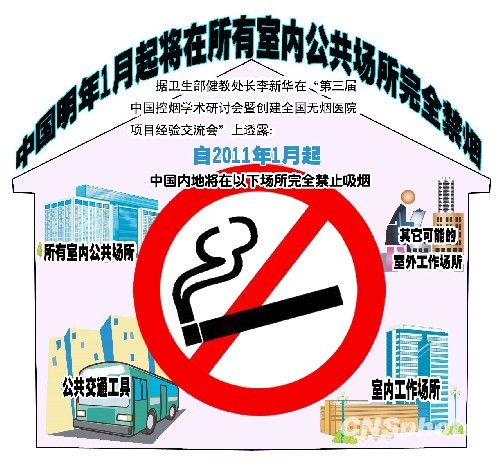 5月10日,衛(wèi)生部婦幼保健與社區(qū)衛(wèi)生司司長楊青在衛(wèi)生部例行新聞發(fā)布會上指出,根據(jù)世界衛(wèi)生組織《煙草控制框架公約》要求,自2011年1月起,我國應當在所有室內公共場所、室內工作場所、公共交通工具和其他可能的室外公共場所完全禁止吸煙。