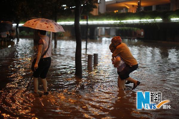 5月14日晚,市民在廣州中山涉水通過馬路。新華社記者 吳魯 攝