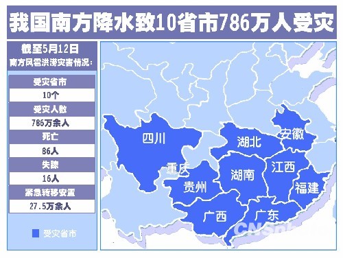 新聞圖表:中國南方強降水致10省市786萬人受災 中新社發 趙乃育 攝