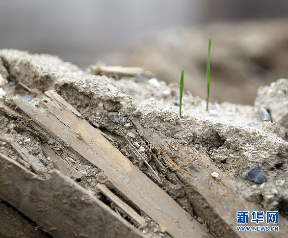 8月20日,在甘肅舟曲泥石流災害造成的廢墟上,一株小草吐露綠意。在舟曲遭受特大山洪泥石流災害的廢墟之上,慢慢生長出來的綠草傳遞著生命的希望。 新華社記者 任正來 攝