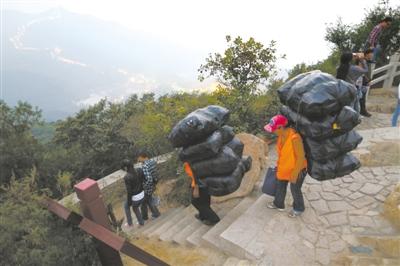 下午5時30分左右,太陽落山,長城上的游客陸續(xù)開始散去。此時,清潔工們開始最后一次全面清理。“四樓以上沒有燈,天黑了就什么也看不見了,必須抓緊時間下山。”王化金說罷,便幫瘦弱的妻子背上3袋瓶子、1袋垃圾,自己背上了1袋瓶子和3袋垃圾。