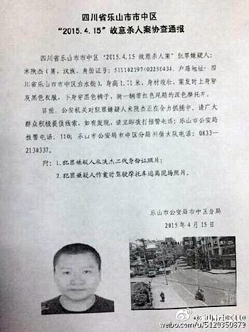 4月15日中午12時20分許至1時30分許,犯罪嫌疑人米陜杰在樂山中心城區(qū),先后將其三弟米延杰、大哥米川杰、米川杰女友黃某某先殺。作案后,米陜杰騎摩托車逃離現(xiàn)場。樂山市市中區(qū)警方發(fā)出“協(xié)查通報”,公布了米陜杰的二代身份證照片、作案時駕駛摩托車逃離現(xiàn)場的照片。