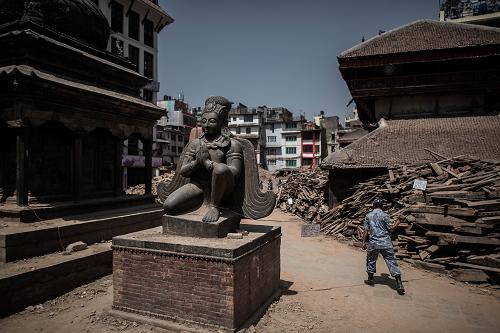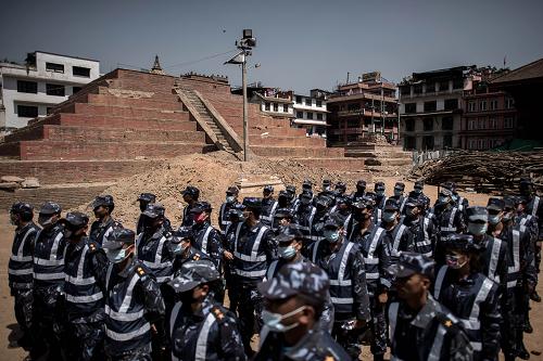 5月3日,在尼泊爾首都加德滿都,尼泊爾警察集結,準備清理杜巴廣場的廢墟。