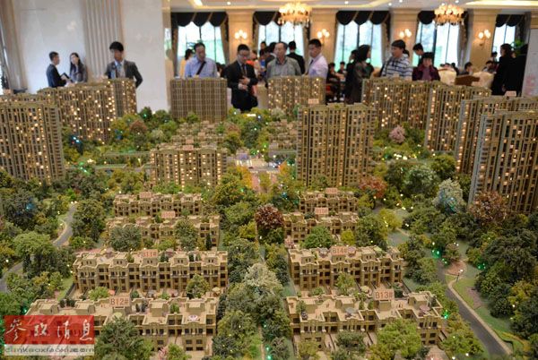 資料圖片:2014年4月12日,購房者在河北涿州市某樓盤銷售中心查看住宅沙盤。據房產銷售人員介紹,來自北京的顧客占到八成左右。連日來,京津冀一體化成為北京周邊各大樓盤重要的宣傳主題。新華社記者 王曉 攝