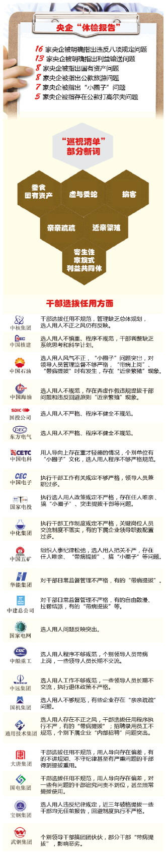 2014年中央巡視組第三輪巡視,覆蓋了包括8家央企在內的13家被巡視單位,在8家央企中,有7家存在選人用人問題,中國聯通、華電集團、東風公司和南方航空被點名存在干部“帶病提拔”問題。