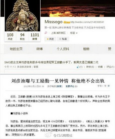 2013年11月8日,有網友爆料稱,SMG星尚頻道美女主持劉彥池已與上海知名運動員、乒乓球世界冠軍王勵勤分手。上海熱線記者從星尚頻道內部知情人處證實,王勵勤劉彥池確已分手。而更有消息稱,劉彥池的新男友是一位富二代!這一消息一出,不禁令人唏噓不已。聯想到當初,劉彥池為了愛情、為了王勵勤專門從成都來到上海發展,并一躍成為上海灘家喻戶曉的一名女主播,當愛已成往事,我們只能留下一聲嘆息。