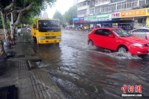 7月23日,武漢暴雨漬水嚴重,導致的部分路段嚴重漬水,也給當地民眾出行造成影響。中新社發 張暢 攝