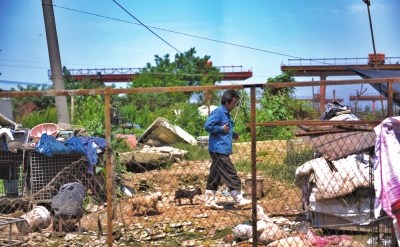 于從球的狗籠子大多不封頂,上面有一層很薄的黑紗布遮陽,地面溫度不低于40攝氏度,很多狗被熱得趴在地上一動不動。于從球的孫子和孫女平時就在這些黑紗布下的狗籠之間穿梭嬉戲。