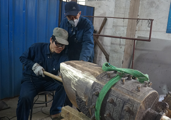 劉佑年正在指導徒弟打磨編鐘。中國網信網 馬頔 攝