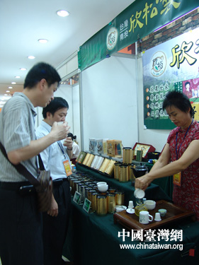 展會上的花東金針和土雞油蔥酥吸引了不少參觀者上前詢問,來自花東奇雞養生集團的負責人告訴記者,此次展銷會上展示的只是集團中的部分產品,還有許多特色產品沒有在此展出。會場另一端,有來自欣松集團的茶文化展示也吸引了不少參觀者,許多嘉賓一邊欣賞茶道表演,一邊品嘗香醇的臺灣特色茶葉。(陳寧)