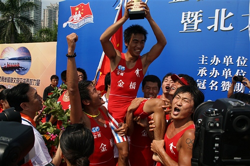 賽后,舉行了兩岸賽艇挑戰(zhàn)賽的冠亞季軍頒獎(jiǎng)儀式和北大清華頒獎(jiǎng)典禮。各支獲獎(jiǎng)隊(duì)伍都表現(xiàn)出了極大的熱情,特別是再次獲勝的北大賽艇隊(duì),他們高高地舉起獎(jiǎng)杯,揮舞著黝黑的手臂,不斷的歡呼,整個(gè)頒獎(jiǎng)臺(tái)成了他們激動(dòng)表演的舞臺(tái),也吸引了大多數(shù)現(xiàn)場媒體的閃光燈。整個(gè)賽場,他們成了絕對(duì)的焦點(diǎn)。(徐麗麟)