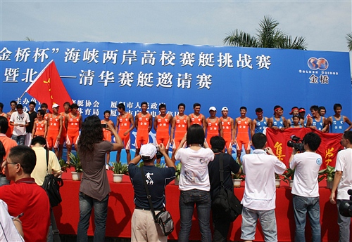 中國臺(tái)灣網(wǎng)9月1日廈門消息 2007“金橋杯”海峽兩岸高校賽艇挑戰(zhàn)賽暨北大——清華賽艇邀請(qǐng)賽今天在廈門舉行,廣州華南師范大學(xué)賽艇隊(duì)以8分15秒的成績?nèi)〉霉谲姡状螀①惖呐_(tái)灣輔仁大學(xué)隊(duì)也取得第四名的優(yōu)異成績。而在已有8年歷史的北大——清華賽艇邀請(qǐng)賽中,北大再次擊敗清華。賽后,興奮的北大隊(duì)員歡呼雀躍,他們成了賽場的絕對(duì)焦點(diǎn)。