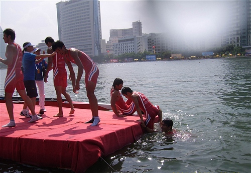 獲勝后的北大隊(duì)員們興奮的跳入水中,在岸邊拍攝的記者的相機(jī)鏡頭躲閃不及,被濺上了水花。