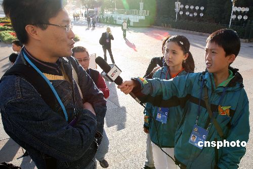 兩名中央電視臺特約小記者10月15日上午在北京人民大會堂采訪臺灣記者。中新社發 任晨鳴 攝
