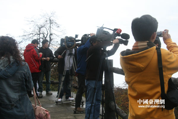不顧一路旅途的疲憊,也不顧山上冰冷的雪霜,臺灣媒體團一路直上峨眉金頂。“天上金頂,天下峨眉”,金頂上云霧飄渺,有如人間仙境。媒體團的記者們一下車就投入到令人向往的云中仙境中,感嘆大自然的鬼斧神工和山水間的寫意勾勒。才剛見到峨眉山的一角,臺灣記者們就已經迫不及待地擺開架勢,支起攝像機、照相機,想把看到的全部美景都捕捉下來。