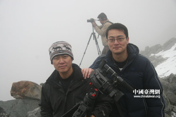 在貢嘎冰川上臺灣明視電視臺、臺灣TVBS電視臺的攝影師正在拍攝。(攝影:陳寧)