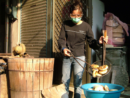 繼光餅一早開賣,通常上午八時至九時就賣完了,做餅的師傅前一天要先讓面團發酵,最遲清晨五時要開始揉面。燒爐、貼爐要相當技巧,只見高明中一邊解說,兩手不停地將面團貼上高溫約攝氏四百度的爐子,分秒必爭,只因為溫度不對了,面團就會掉到炭火里。