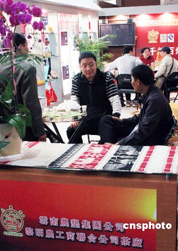 11月26日,由8家茶廠34位業者組成的云南普洱茶參展團,在臺北茗茶·咖啡暨美酒展上向臺灣采購商和民眾積極推介普洱茶,反響熱烈。這是云南普洱茶廠商第一次組團來臺參展拓展市場。普洱茶具深厚的文化背景及豐富的茶性變化,有“云南產、香港賣、臺灣藏”之說,“越陳越香”的概念最早由臺灣收藏者炒作出來。為期4天的該展覽于當日傍晚閉幕,720個攤位和400家廠商參展,規模居歷年之冠。中新社發 黃少華 攝