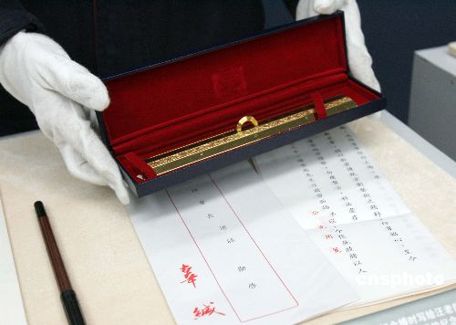 在汪老生前收藏的辜振甫夫婦金婚紀念品“龍鳳金鎮紙”前,一對臺胞老夫婦合影留念。他們說,金鎮紙也寓意著“兩岸一家親”。幾位年輕的臺商太太則希望,當年見證汪辜會晤的大陸知名記者為眾人簽名留念。