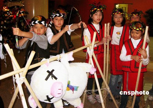 十二月十五日,隨父母移居上海的臺灣小學生,在上海熱演富有高山族風情的“原鄉之舞”,迎接即將到來的新年。當天,一年一度的“原鄉杯”臺胞青少年大賽在上海落幕,來自上海、臺北兩地的千余名臺灣少年參與比賽,獲獎的佼佼者匯聚上海迎新年、“秀”才藝。這一跨越臺灣海峽的臺胞青少年交流活動,由上海市臺灣同胞聯誼會主辦。 中新社發 許曉青 攝
