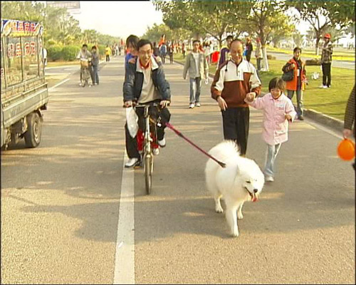 最喧賓奪主的助威者:今年有廈門市民甚至把心愛的寵物犬也帶到了比賽現場。渾身雪白的薩摩犬出現在美麗的賽道上,眾人的目光不由得被吸引。全民健身,狗狗也不缺席。