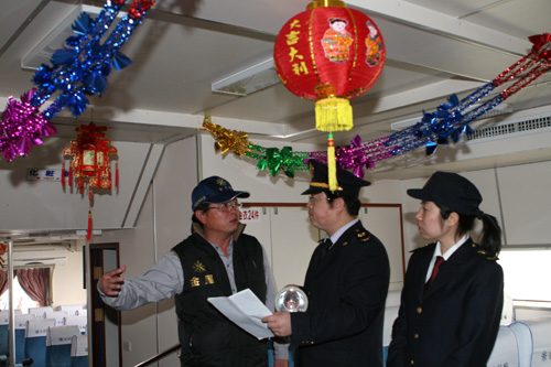 臺輪金星號將于當天下午3時30分左右靠泊和平碼頭。在此條航線上跑的兩岸各4艘客輪中,“金星”號客輪是最新加盟的,去年10月才剛剛投入。家在高雄的大副高建輝先生表示,對這條航線很有信心。他一邊指著船上張掛的各色彩燈、彩帶和春聯,一邊很坦然地告訴記者,自己根就在福建,去年元宵節還專門到長樂尋根。“兩岸一家親,不管做什么都很容易溝通”,他手里拿著兩盤全新的DVD音樂帶《新年熱鬧鬧》、《雙星報喜》,說,“這些都是昨天在廈門買的。掛上了紅艷艷的彩帶啊什么的,真得感到過年好溫馨,船一開,我們就把這兩個帶子放出來給大家聽,一定會更熱鬧!”