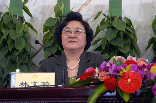 2008年3月6日15時,人民大會堂新聞發布廳舉行全國政協十一屆一次會議記者招待會,主題是“民主黨派中央主席談多黨合作”。圖為臺盟中央主席林文漪。新華網 郭毅 攝