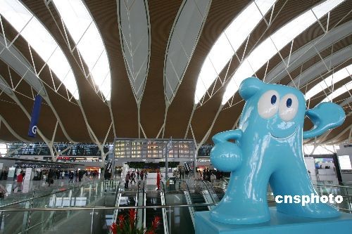 許多臺胞在登機前紛紛抓緊時間,與新航樓候機大廳內的上海世博會吉祥物“海寶”雕塑合影留念。