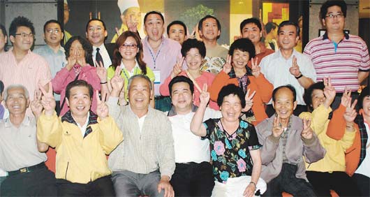 臺祥鶴旅游團11名首批脫困團員,昨天晚上接受成都市臺商協會宴請,許多團員合影時比出“ya”手勢,慶幸歷劫歸來。(中央社) |