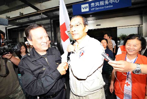 5月20日,臺灣紅十字醫療隊隊長陳長文(前右)走出成都雙流國際機場。當日,來自臺灣的紅十字醫療隊一行37人抵達四川成都雙流國際機場,隨后將前往德陽市,開展醫療救治。 新華社記者 李濤 攝