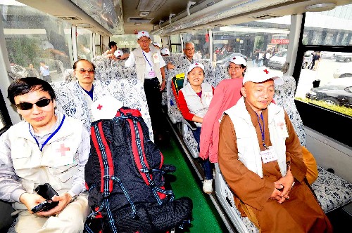 5月20日,臺灣紅十字醫療隊隊員乘坐大巴離開成都雙流國際機場。 新華社記者 李濤 攝