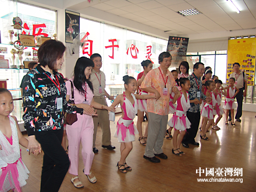 “孩子們真是多才多藝!”一下車,參訪團的成員便被在廣場上跳拉丁舞的孩子們所吸引。來到拉丁舞教室,在極具節奏感的音樂“誘惑”下,與正在上課的孩子們一起跳了起來。副團長葉新拉著孩子的門的手一邊跳舞,還不時的低頭詢問孩子們的學習情況。