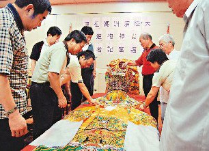 中新網(wǎng)5月28日電 臺灣云林縣西螺廣福宮日前至大陸湄洲島進香謁祖,祖廟感念分靈多次“探親”,特致贈媽祖金身神袍,歷史上百年,全臺僅此一件。廣福宮如獲至寶,昨天展示,吸引不少民眾爭睹祖靈風采。