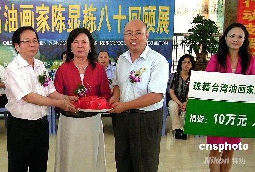 5月30日上午,瓊籍臺灣著名油畫家陳顯棟先生(左一)在椰城舉行的"八十回顧展"開幕式上,通過海南省紅十字會向四川汶川中學(xué)捐贈(zèng)十萬元人民幣現(xiàn)金,支援災(zāi)區(qū)重建。 中新社發(fā) 馬浩楠 攝