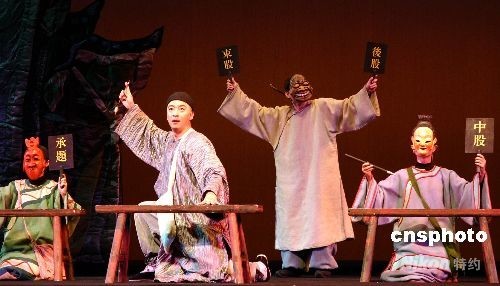 六月五日,繼劉曉慶的《金大班的最后一夜》之后,時隔半年,上海話劇藝術中心的又一代表作黑色幽默古裝劇《秀才與劊子手》在臺北首演。二00七年一舉囊括大陸文華獎劇目、編劇、導演、表演等數項大獎的這部古裝黑色幽默話劇,講述清光緒年間朝廷廢除科舉制度與酷刑后,窮秀才徐圣喻和劊子手馬快刀“失業”而導致命運交錯的故事。 中新社發 許曉青 攝