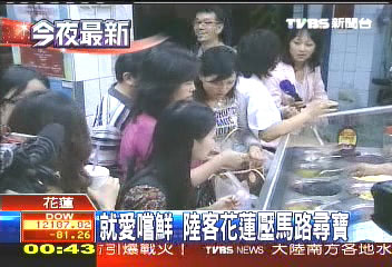 中新網6月18日電 據臺灣TVBS報道,大陸赴臺游踩線考察團昨天晚上抵達花蓮,不顧先前勞頓,依舊精力旺盛,吃東西、買東西,對花蓮的名產樣樣覺得很新鮮。花蓮業者半買半送,希望口碑能借由考察團帶回大陸。