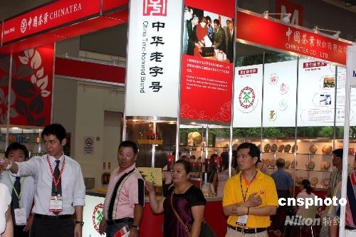 “臺(tái)北國(guó)際食品展”六月十八日在臺(tái)北世貿(mào)南港展覽館開幕。此屆食品展有七百六十八家廠商參展,使用一千六百零九個(gè)攤位,其中,大陸有三十九家廠商參展。圖為中茶公司在“臺(tái)北國(guó)際食品展”布置的引人注目的攤位,臺(tái)灣民眾對(duì)臺(tái)灣不出產(chǎn)的普洱茶頗感興趣。 中新社發(fā) 耿軍 攝